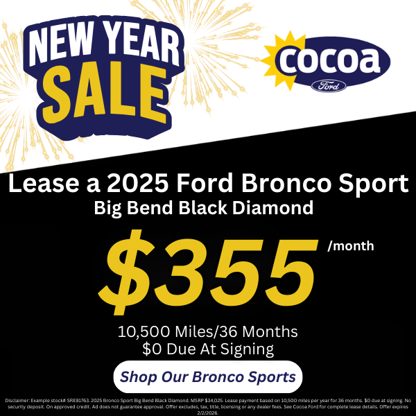 Disclaimer: Example stock# SRE91763. 2025 Bronco Sport Big Bend Black Diamond. MSRP $34,025. Lease payment based on 10,500 miles per year for 36 months. $0 due at signing. No security deposit. On approved credit. Ad does not guarantee approval. Offer excludes, tax, title, licensing or any dealer fees. See Cocoa Ford for complete lease details. Offer expires 2/2/2026.