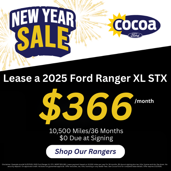 Disclaimer: Example stock# SLE57029. 2025 Ford Ranger XL STX. MSRP $35,390. Lease payment based on 10,500 miles per year for 36 months. $0 due at signing plus tax, title, license and doc fee down. No security deposit. On approved credit. Ad does not guarantee approval. Offer excludes, tax, title, licensing or any dealer fees. See Cocoa Ford for complete lease details. Offer expires 2/2/2026.
